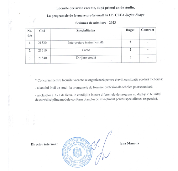 CENTRUL DE EXCELENȚĂ ÎN EDUCAȚIE ARTISTICĂ ȘTEFAN NEAGA anunță concurs pentru admiterea candidaților anul de studii 2023-2024 la specialitățile: