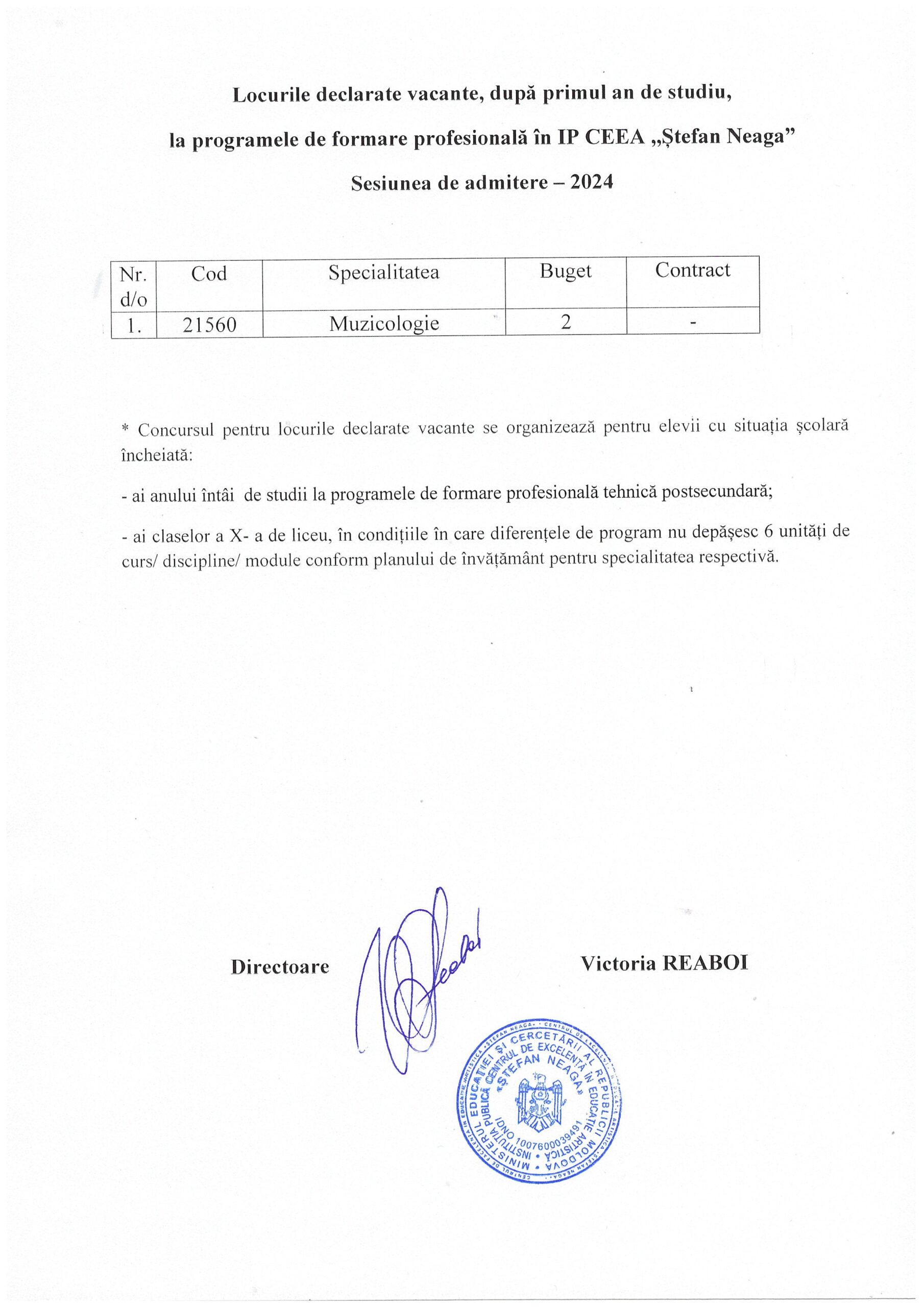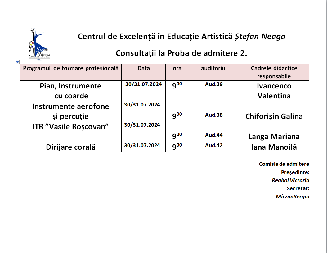 CENTRUL DE EXCELENȚĂ ÎN EDUCAȚIE ARTISTICĂ ȘTEFAN NEAGA anunță concurs pentru admiterea candidaților anul de studii 2024-2025 la specialitățile: