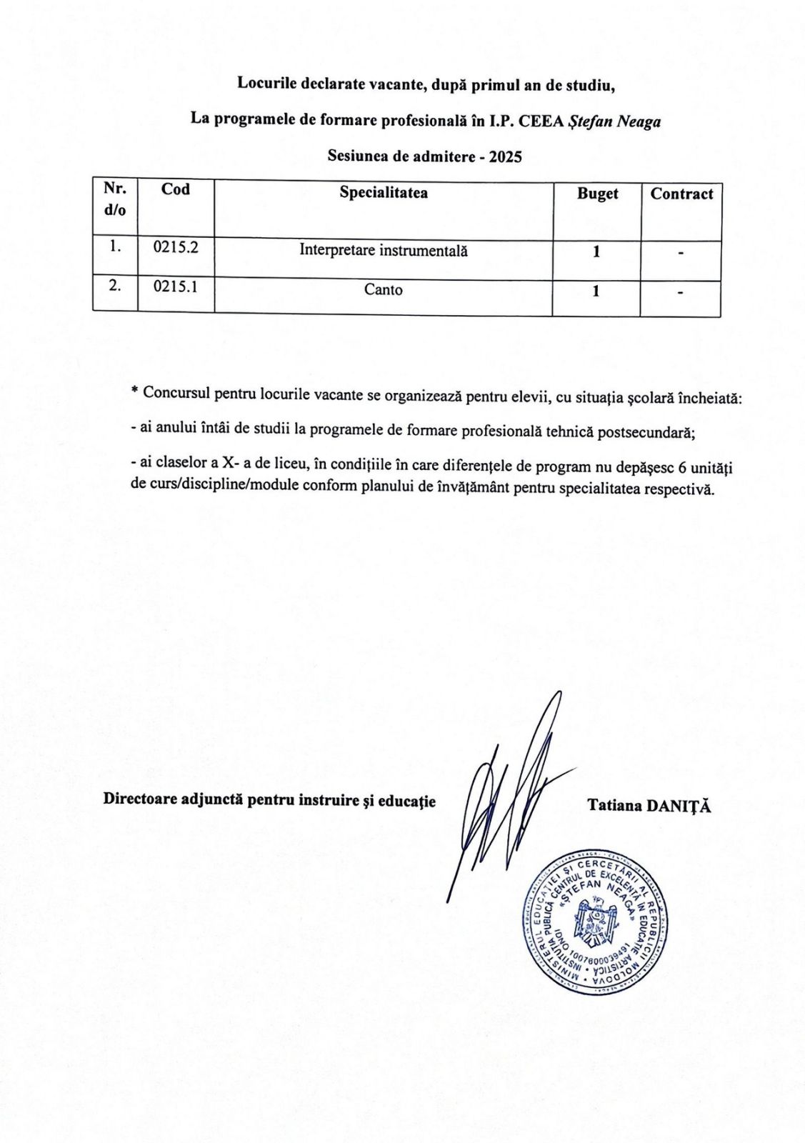 CENTRUL DE EXCELENȚĂ ÎN EDUCAȚIE ARTISTICĂ ȘTEFAN NEAGA anunță concurs pentru admiterea candidaților anul de studii 2025-2026 la specialitățile: