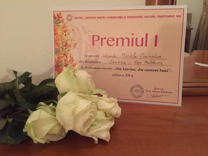 CENTRUL JUDEȚEAN PENTRU CONSERVAREA ȘI PROMOVAREA CULTURII TRADIȚIONALE IAȘI a oferit elevei, Mariela Sainciuc – PREMIUL I, în cadrul Festivalului – concurs „ Din bătrîni, din oameni buni”, ediția XII organizat la data de 23 noiembrie 2019.