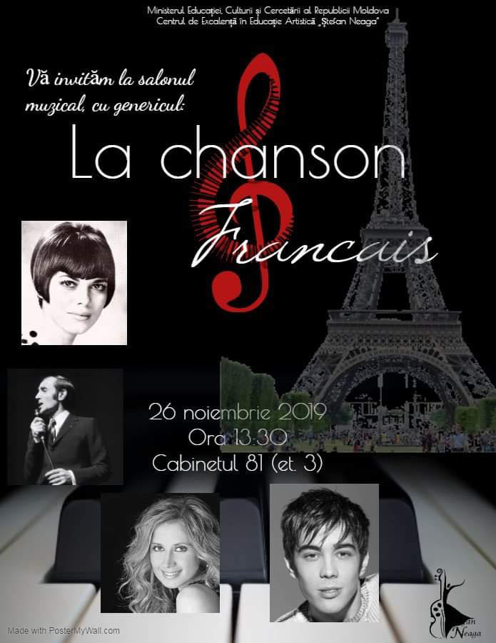 Salonul muzical, cu genericul “La Chanson Francais”, a avut loc marți, la data de 26 Noiembrie 2019, în incinta Centrului de Excelență în Educație Artistică “Ștefan Neagă”, cabinetul 81. Activitatea sa desfășurat sub îndrumarea profesorilor de literatura muzicală Galina Rublicean și Neli Martînenco, cu participarea elevilor de la catedra de Muzicologie, anul IV: Natalia Marcu, Iraida Iordan, Cristian Mocanu, anul III: Vladimir Șciogolev, Adrian Borta, și a studenților de la AMTAP: Corina Țaca și Corina Baranovschi, absolvente a CEEA “Ștefan Neaga”. În cadrul salonului muzical, sa vorbit despre reprezentanții chansonului din diferite generații, precum Edith Piaf, Charles Aznavour, Mireille Mathieu, Joe Dassin, Lara Fabian și Gregori Lemarchall. Salonul muzical, cu genericul “La Chanson Francais”, a avut loc marți, la data de 26 Noiembrie 2019, în incinta Centrului de Excelență în Educație Artistică “Ștefan Neagă”, cabinetul 81. Activitatea sa desfășurat sub îndrumarea profesorilor de literatura muzicală Galina Rublicean și Neli Martînenco, cu participarea elevilor de la catedra de Muzicologie, anul IV: Natalia Marcu, Iraida Iordan, Cristian Mocanu, anul III: Vladimir Șciogolev, Adrian Borta, și a studenților de la AMTAP: Corina Țaca și Corina Baranovschi, absolvente a CEEA “Ștefan Neaga”. În cadrul salonului muzical, sa vorbit despre reprezentanții chansonului din diferite generații, precum Edith Piaf, Charles Aznavour, Mireille Mathieu, Joe Dassin, Lara Fabian și Gregori Lemarchall.