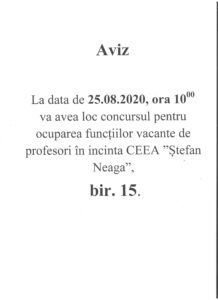 Candidații pentru ocuparea funcției de șef de secție vor prezenta la Centrul de Excelență în Educație Artistică „Ștefan Neaga”, personal sau prin reprezentant, prin poștă sau prin e-mail, în termen de 20 zile calendaristice din ziua publicării în presă și pe pagina web www.ceneaga.md a anunțului, următoarele acte: